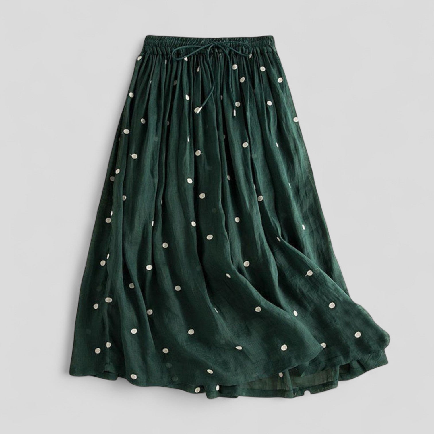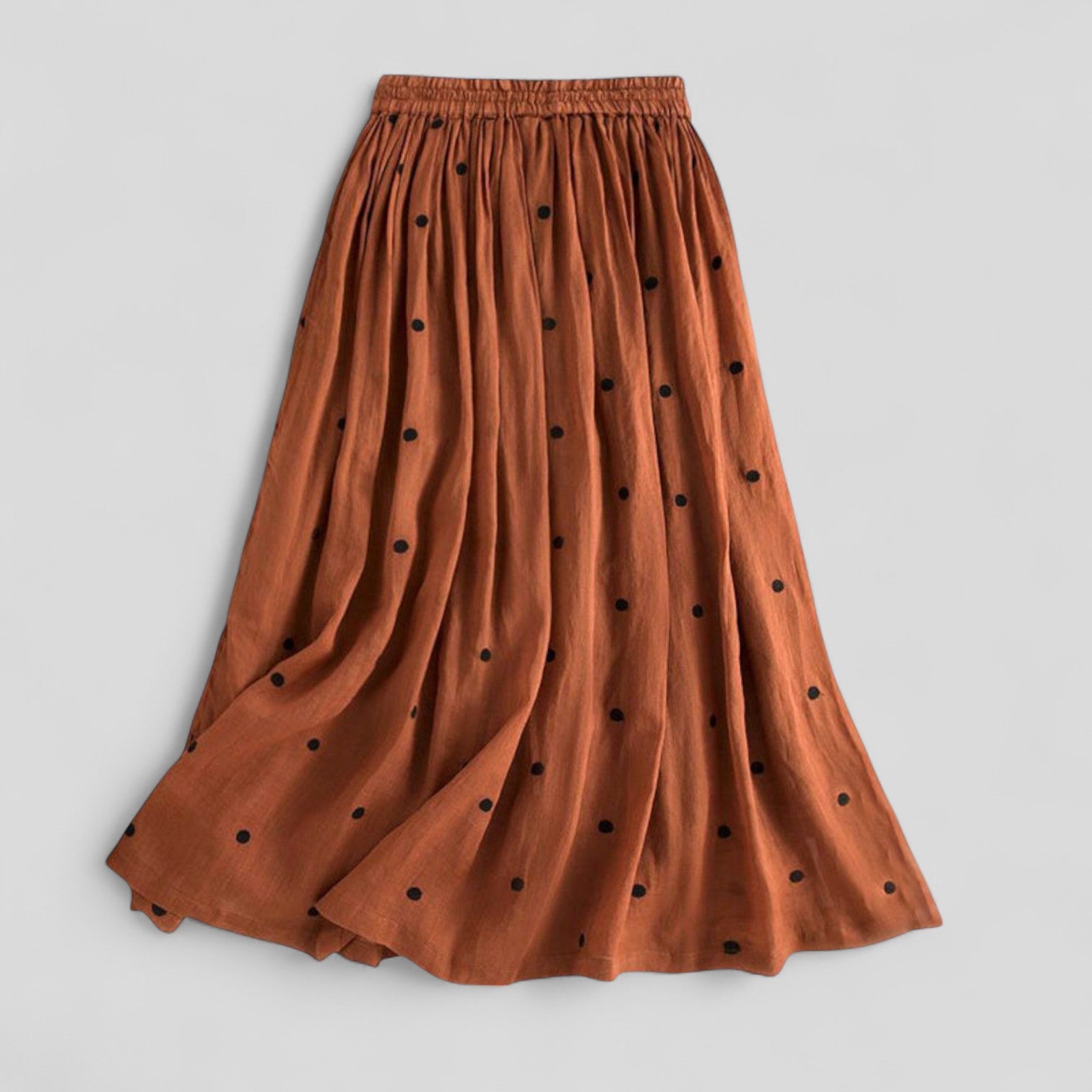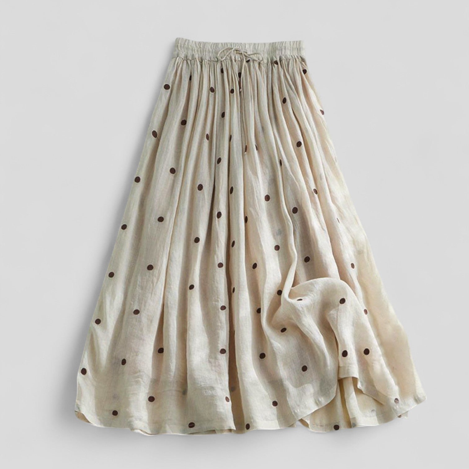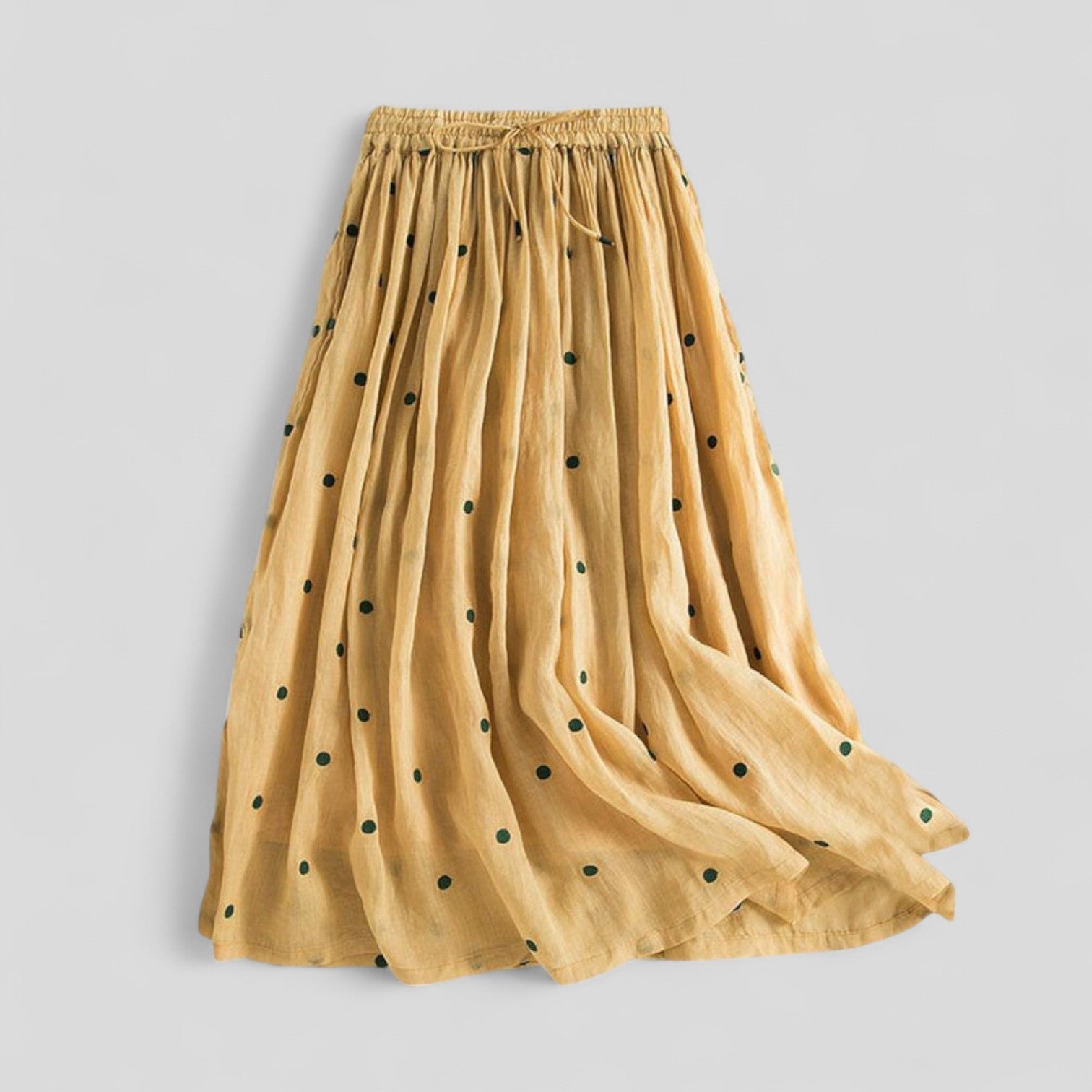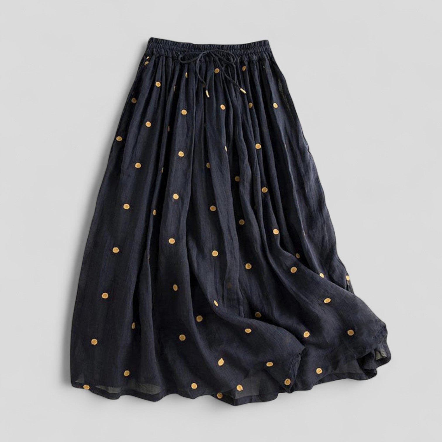 Descubre el encanto de nuestra falda larga y fluida, diseñada con una calidad ligera y aireada. Su cintura elástica garantiza un ajuste cómodo, adaptándose perfectamente a diferentes medidas. Los suaves pliegues permiten que la falda caiga elegantemente, ofreciendo una sensación ligera y sofisticada.