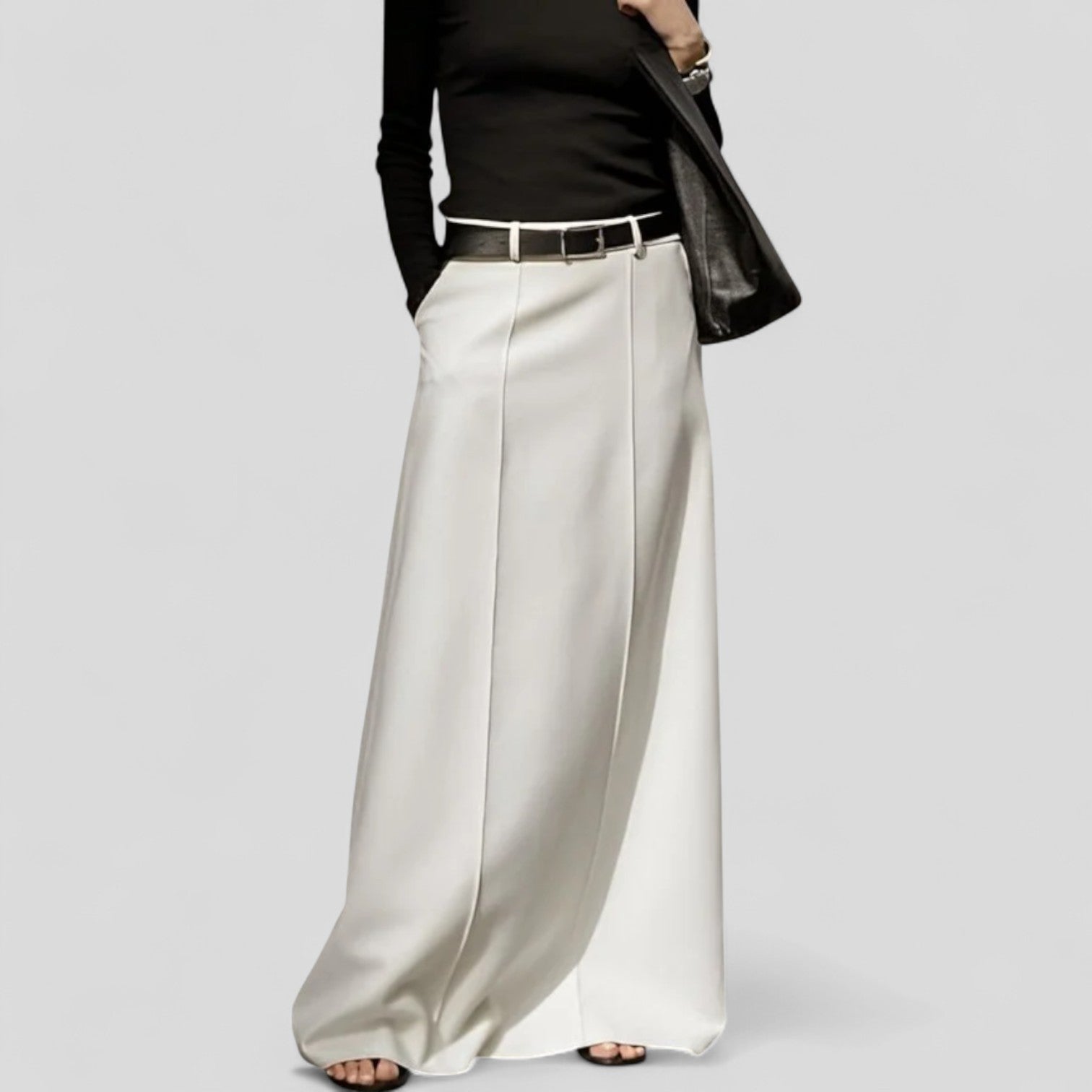 Esta falda larga y fluida aporta líneas puras a tu armario. Ideal para combinar con tops ajustados o sueltos.