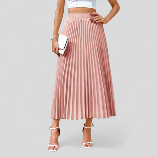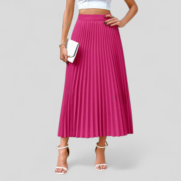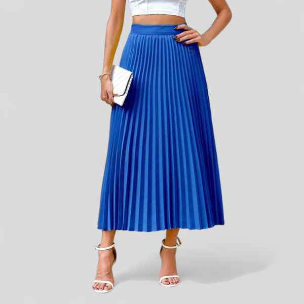 Elegancia Atemporal: Esta falda midi se distingue por su línea clara y finos pliegues, aportando un toque de ligereza femenina.
