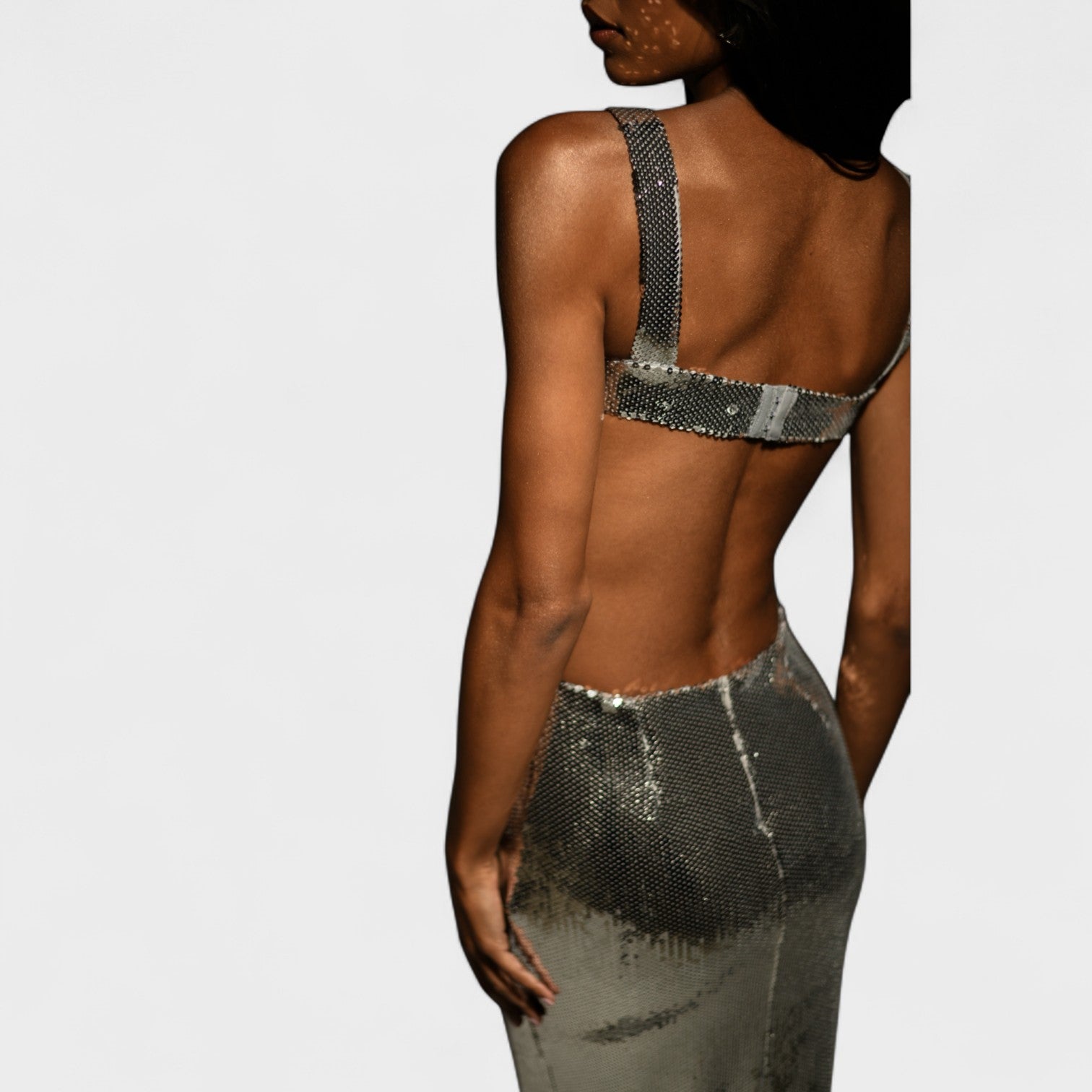 El vestido Gala Silver capta la atención desde el primer instante. Su tejido de lentejuelas brillantes refleja la luz con elegancia, mientras las aberturas laterales enmarcan la silueta con sensualidad. Diseñado para mujeres que se atreven a destacar en cada paso.
