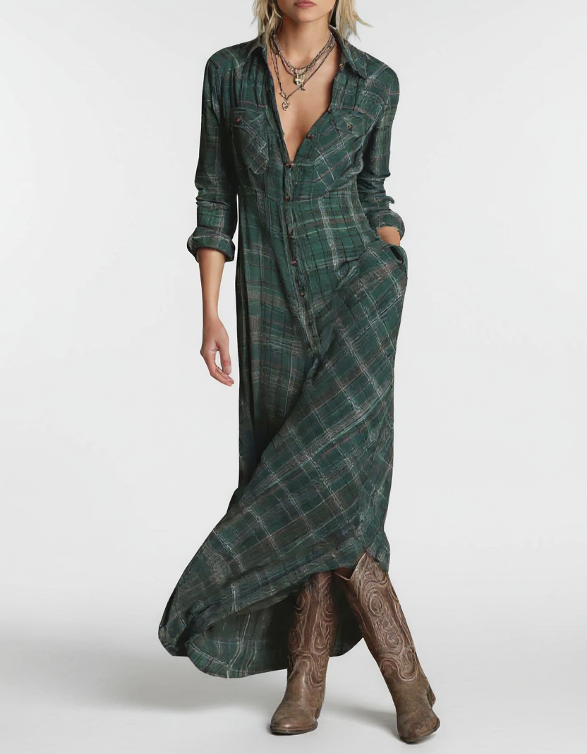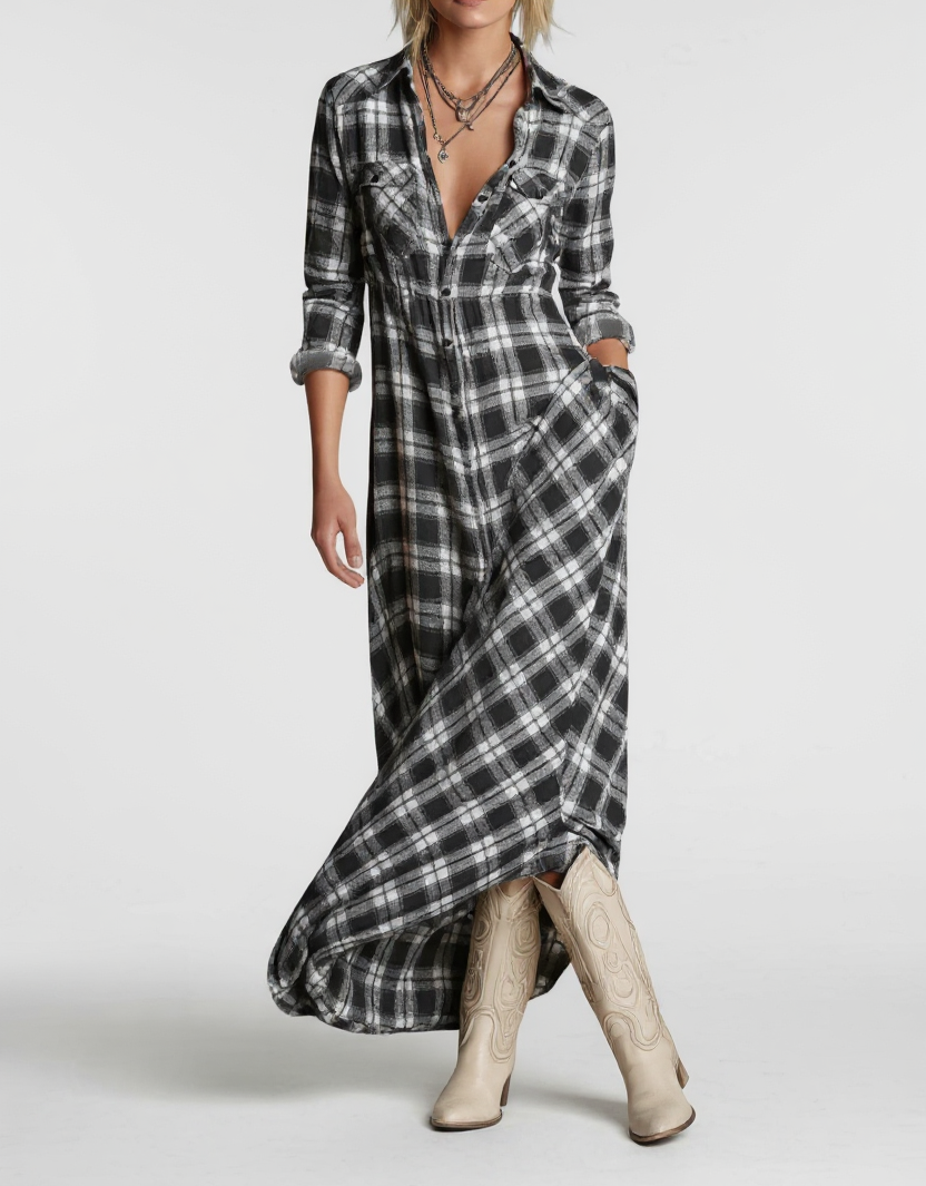 El vestido Rosa combina elegancia relajada y elegancia clásica. Con su tapeta, cuello tipo camisa y mangas largas, es ideal para la transición del día a la noche. Su largo maxi fluido le otorga una sofisticación natural, mientras que su estampado de cuadros añade un toque de encanto moderno.