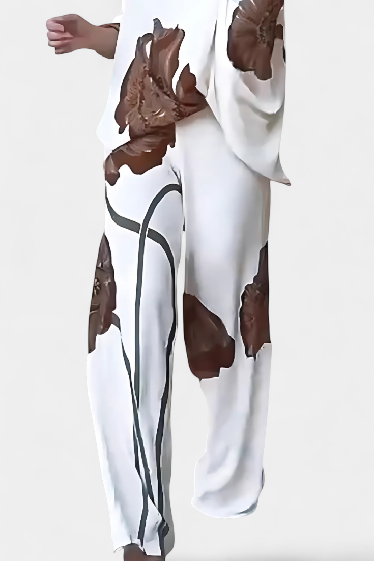El conjunto Jessie fusiona un top asimétrico de manga murciélago con un estampado floral llamativo y un pantalón recto de ajuste holgado. Diseñado para ofrecer libertad de movimiento y un aire relajado pero con carácter.