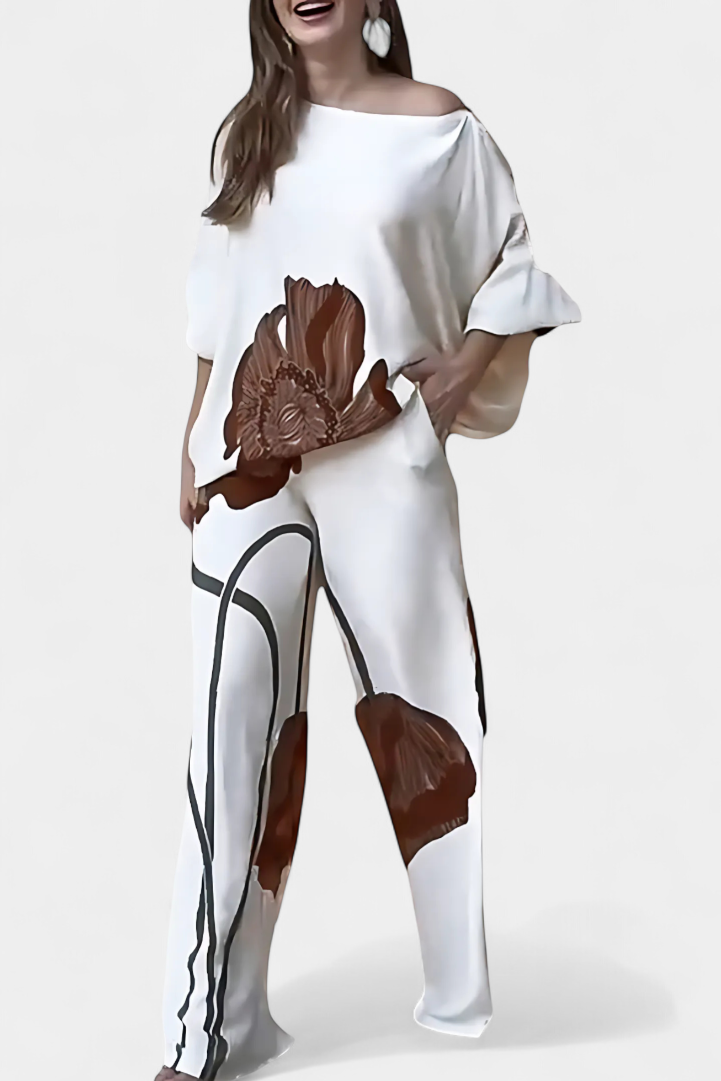 Sybella | Conjunto Floral de Dos Piezas con Hombro Descubierto y Pantalón Recto
